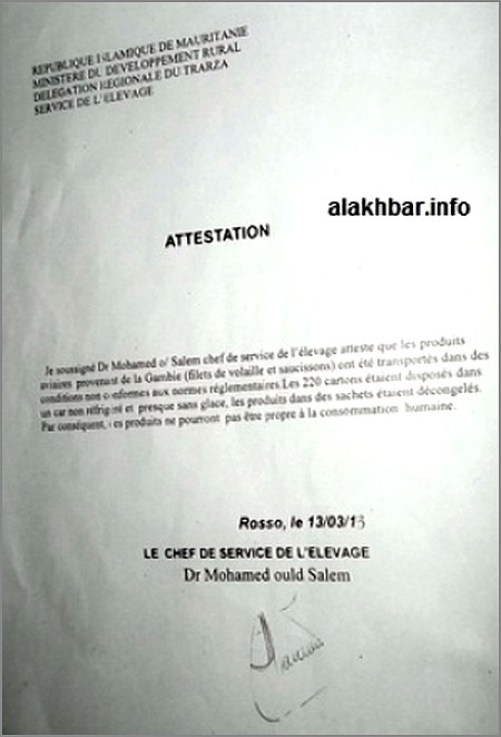 La cargaison (2000 kilogrammes emballés dans 200 cartons) appartenant au commerçant Ahmeddou Moustapha Ould Waw est en provenance de la Gambie. Les mauvaises conditions d’acheminement l’ont fait pourrir, a constaté le médecin-chef du service vétérinaire de Rosso, Mohamed Ould Salem.