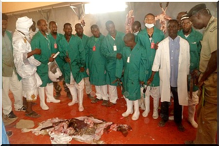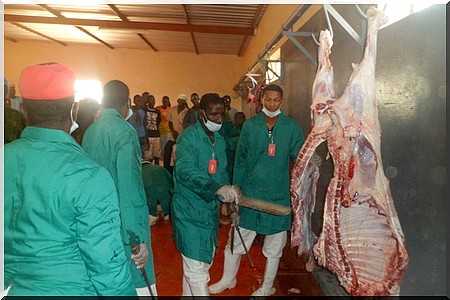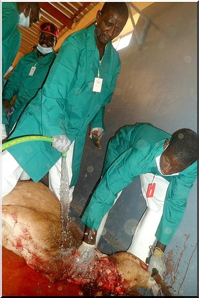 Désormais, la traçabilité et la sécurité de la viande en seront renforcées par un contrôle à priori du bétail sur pied, et un contrôle à fortiori après l’abattage. Avant d’assister à une séance de démonstration d’abattage d’un bovin à l’intérieur de la salle.