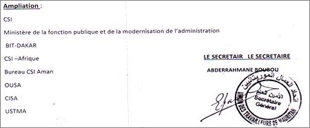 Par ailleurs , cette lettre vient dénoncer la campagne orchestrée par la CGTM qui se targue d’être la centrale syndicale la plus représentative ce qu’elle annonce dans tous les forums ,les rencontres nationales et internationales ,dans ses différentes déclarations dont parfois ampliation est faite à votre auguste institution et par voie de protestation déposée auprès de la commission de l’organisation internationale du travail (OIT).