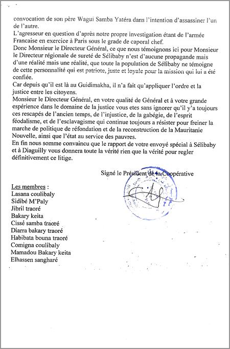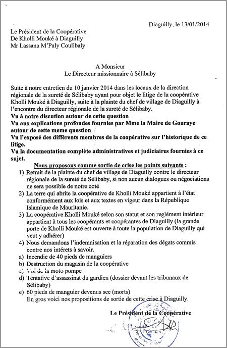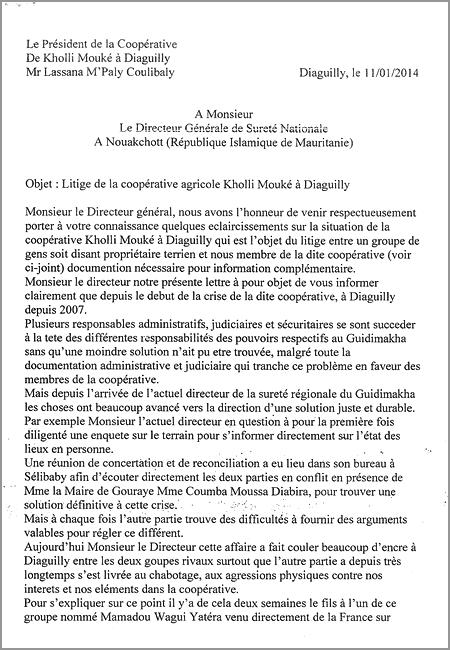 Ainsi dans la première correspondance adressée au Directeur Général de la Sûreté Nationale, les membres de l’organisation paysanne louent les efforts du directeur régional de la sûreté au Guidimakha pour son rôle dans la recherche de solution au problème qui n’a que trop duré.