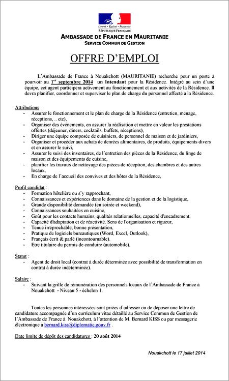 L’Ambassade de France à Nouakchott (Mauritanie) recherche pour un poste à pourvoir au 1er septembre 2014 un Intendant pour la Résidence.