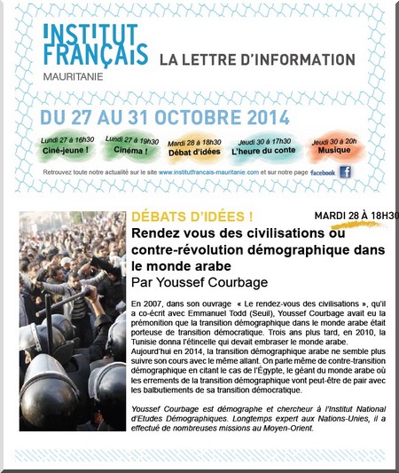 - la conférence de Youssef Courbage le Mardi 28 octobre à 18h30 : « Rendez vous des civilisations ou contre-révolution démographique dans le monde arabe » : une conférence pour ceux que l’explosion démographique inquiète.