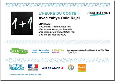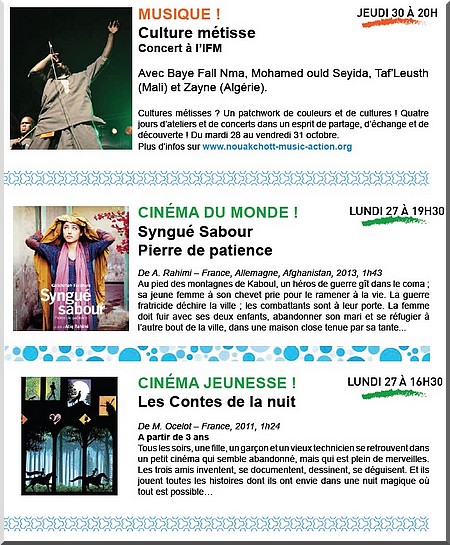 - L’IFM accueille la deuxième édition « CULTURE METISSE » organisée par l’association « Nouakchott Music Action » : des ateliers de formation, des résidences de création musicale et concert à l’IFM le jeudi 30 octobre à 20h00.
