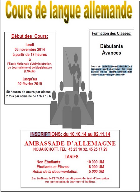 Lundi 3 novembre 2014 à partir de 17 heures à l'École Nationale d’Administration, de Journalisme et de Magistrature (ENAJM) jusqu'au 2 février 2015.50 heures de cours par classe 2 fois par semaine de 17h à 19 h.