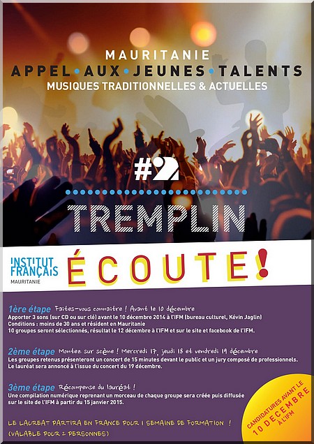 IFM - Suite au succès de la première édition du Tremplin Ecoute ! La Jeune scène musicale mauritanienne organisé par l’Institut français de Mauritanie en février 2014, nous renouvelons l’évènement : deuxième édition du tremplin !