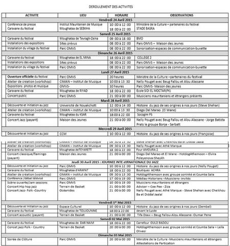 Pour éclairer l’opinion publique sur les activités du festival et son importance, une conférence de presse sera organisée le 24 avril 2015 à 10h à l’Institut Mauritanien de Musique, au sein la nouvelle maison des jeunes. Du 24 avril au 2 mai, une caravane mobile véhiculant des messages de paix et d’unité visitera les 9 Moughataas de Nouakchott.