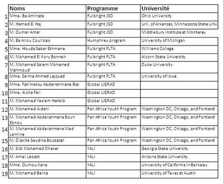 Ces étudiants ont pu rivaliser sur une période de 18 mois à travers des tests, et des interviews pour être finalement acceptés par un jury en Mauritanie et à Washington dans le cadre de nos programmes «Fulbright», «Humphrey», «Global UGRAD», «Pan-Africa Youth Leadership», et «Mandela Washington Fellowship».
