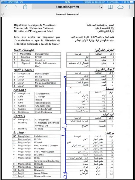 Mourassiloun – Le ministère de l'Education Nationale a publié la liste des 89 écoles privées concernées par la décision de fermeture, réparties sur les 13 wilayas du pays. Ce sont les 3 wilayas de la capitale Nouakchott qui détiennent la part du lion dans ces restrictions visant l’enseignement privé.