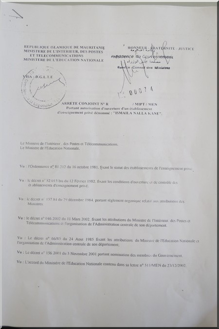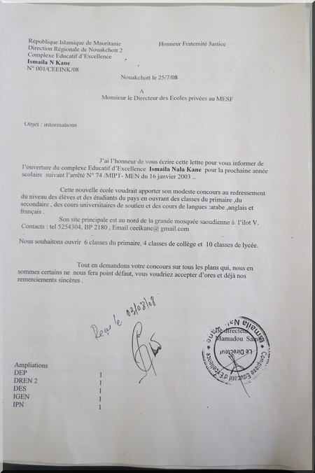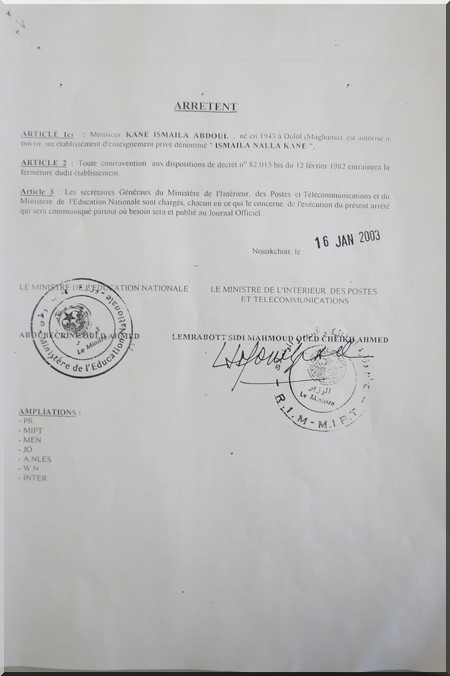 Cet établissement qui se trouve au nord de la grande mosquée Saoudienne dans les Ilots V, a effectivement son agreement, il a été créé par Arrêté conjoint N°R 00074/MIPT/MEN en date du 16 janvier 2003. Un cycle primaire complet le composait à son ouverture, et quatorze classes du secondaire (4 de collège d’enseignement secondaire et 10 du lycée).