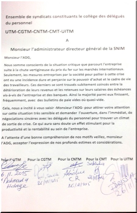 27-11-2015 20:16 - Ensemble de syndicats constituants le collège des délégués du personnel : UTM-CGTM-CNTM-CMT-UITM