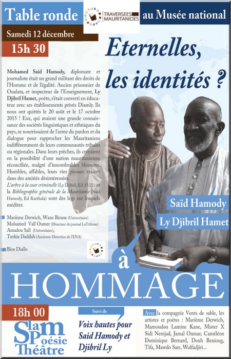 Éternelles, les identités ? Hommage à Saïd Hamody et Ly Djibril Hamet Saïd Ould Hamody, diplomate et journaliste était un grand militant pour la cause des droits de l’Homme et de l’égalité. Ancien prisonnier de Oualata, et inspecteur de l’Enseignement, Ly Djibril Hamet, poète, s’était converti de son côté en éducateur avec ses établissements privés Diamly.