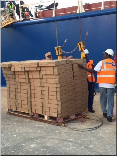 Débarqués par palettes, le produit est pris en charge par la société de manutention puis par les manœuvres pour être positionnés dans des conteneurs, mis à disposition sur le terrain plein par la société Rida Free Zone. C'est la société Maersk Line qui s'occupera ensuite de leur transport vers les clients européens et africains.