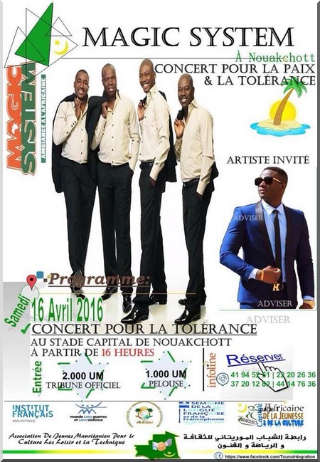 Sangare Dramane - Le consulat de Côte d'Ivoire à Nouakchott, l’Association de la Communauté Ivoirienne en Mauritanie et l’Association des Jeunes Mauritaniens pour la Culture les Loisirs et la Technique (AJMCLT) remercient l’Institut français et Air-France pour leur soutien ainsi que l’hôtel Azalai qui va accueillir la soirée de gala de Magic System le 15 avril 2016 à 20h.