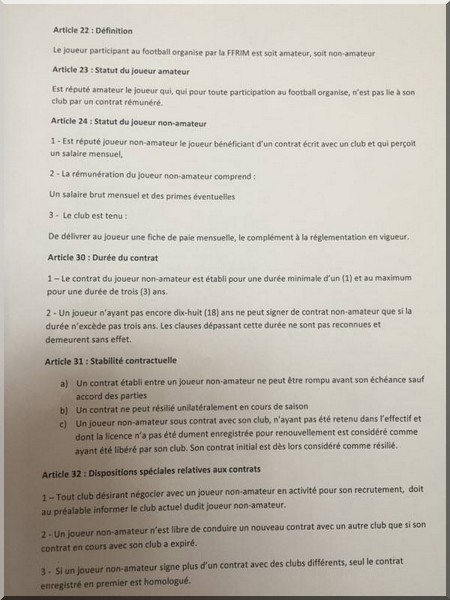 Relativement aux supputations sur l’âge du joueur, le président du FC TVZ clarifie : « Nous faisons très attention. Nous nous remettons au règlement de la FFRIM, voté à l’unanimité, notamment en ses articles 30, 31 et 32, du reste explicites( voir fac similé NDLR), relativement aux dispositions contractuelles et à l’âge du joueur ». Moussa ould Khaïri croit en la bonne foi de la FFRIM : « Nous avons bon espoir que le droit soit dit. Nous sommes confiants et sereins, forts du contrat, dûment établi avec ce joueur, et de la copie du chèque encaissé. Notre engagement réciproque n’est pas verbal. Nous disons, tout haut, que le joueur a bien signé un accord écrit, tout comme son formateur. A Tevragh Zeïna, nous sommes soucieux des droits dus aux entités formatrices, conformément à la réglementation de la FIFA ».