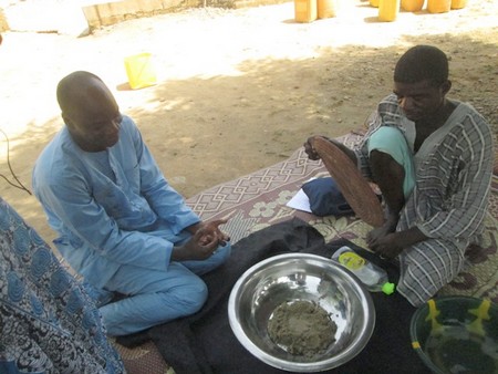 Larou : « il y’a des brisures de mil pilés avec la main et les brisures obtenus sont séparées de la farine avec un tamis, l’oseille de guinée nous provient de nos champs, on a préparé "Larou", qui peut se faire avec des pastèques et des arachides également. Nous avons ajouté dans ce plat des pastèques et cuisiné avec du bois de chauffe. On y retrouve du sel, de l’eau ».
