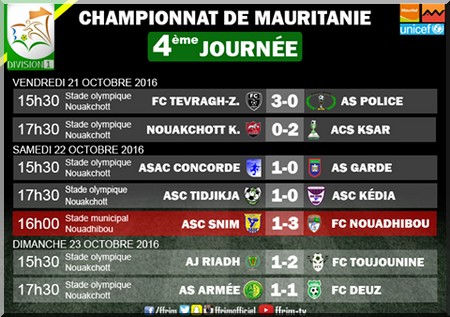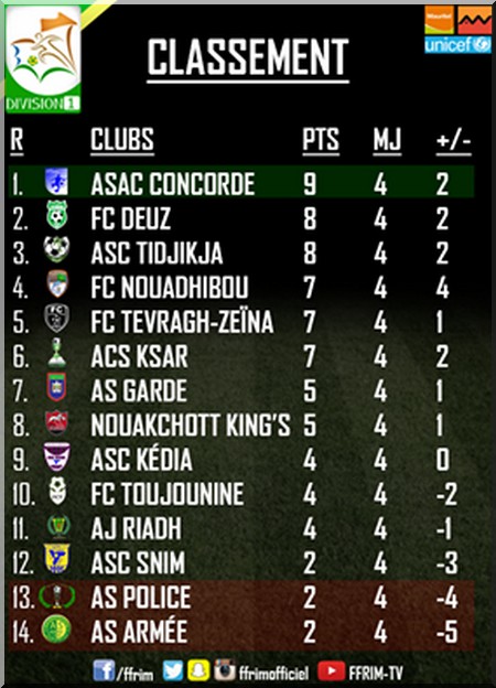 Au pied du podium, trois équipes sont à égalité avec le même nombre de points (7). Le FC Nouadhibou, le FC Tevragh-Zeina et l'ACS Ksar. Deuxième victoire consécutives du Ksar, contre les King's de Nouakchott, dans le cadre de la 4ème journée du championnat. Béchir M'Baye Gueye sur penalty, et Babacar Baguili sont les deux buteurs Ksarois.