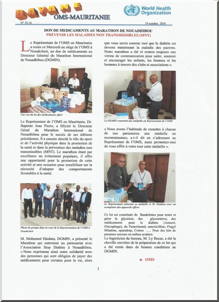 Haidara : Je vous invite à consulter le document de l’OMS appelé BAYANE OMS – MAURITANIE numéro 35.16 ci-joint, s’il vous plait, que je viens de recevoir. Je ne suis pas spécialiste des médicaments, mais un ami dans le domaine m’a dit qu’avec la qualité et la quantité des médicaments reçus ce don peut représenter vers 1 600 000UM (un million six cent mille ouguiyas).