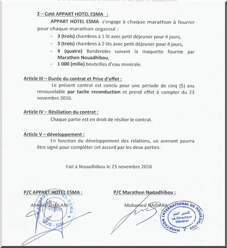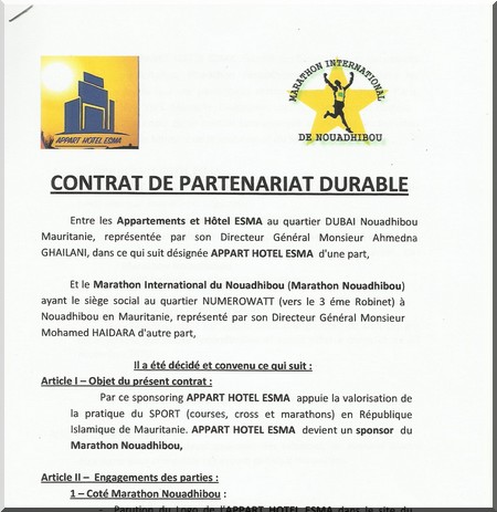A – : Appart Hôtel ESMA va fournir au marathon à chaque marathon 3 chambres single et 3 chambres doubles avec le petit déjeuner de ses occupants pendant 4 jours avec. Il fournira 1 000 bouteilles d’eau minérales et ses 4 banderoles que le marathon mettra,