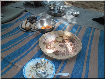 Crudité, salade de riz ou macaroni à base de legumes,macedoine thon , olives, mais ; Riz ou macaroni à la viande, moutarde ; galette sous sable ou sur poele.Oranges, pommes, melon jaune, pasteque rouge, dattes
