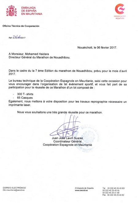 La Coopération Espagnole fournit 300 (trois cents) T-shirts, 65 (soixante-cinq) casquettes et prête au Marathon International de Nouadhibou pour 6 (mois) une imprimante laser avec 2 encres pour les photocopies et impressions (voir la note de la Coopérations Espagnole).