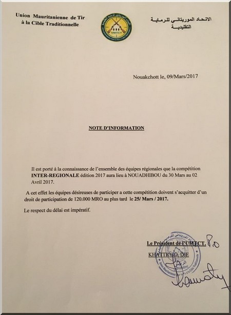 M21 - L'édition 2017 de la coupe inter- régionale du tir a la cible traditionnelle sera organisée à Nouadhibou du 30 mars au 02 avril prochain. C'est ce qu'a décidé le bureau de l'Union Mauritanienne du Tir à la Cible Traditionnelle après une large concertation avec les présidents et capitaines des équipes régionales.