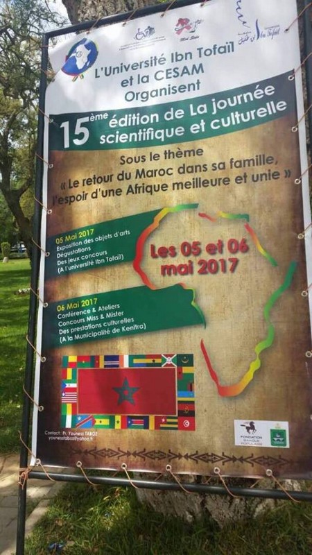 RMI Info - Du vendredi 5 au samedi 6 mai 2017, l’Université Ibn Tofaïl de Kenitra et la CESAM ont organisé la 15ème édition de la journée scientifique et culturelle sous la thématique « Le retour du Maroc dans sa famille, l’espoir d’une Afrique meilleure et unie ». Durant ses deux jours, les étudiants de l’université en provenance de différents pays africains mettent en valeur les cultures et les traditions de leur pays d’origine.