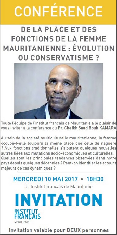 IFM - L’Institut français de Mauritanie a le plaisir de vous inviter à la conférence « De la place et des fonctions de la femme mauritanienne : évolution ou conservatisme ? », par le Pr. Cheikh Saad Bouh KAMARA, le mercredi 10 mai à 18h30.