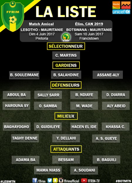 Défenseurs (8) : Abdoul Ba (Rc Lens/France), Sally Sarr (Fc Lucerne/Suisse), Bakary N’diaye (Fc Tevragh-Zeïna), Diadié Diarra (Fc Gueugnon/France), Harouna Sy (Gs Marseille-Consolât/France), Ousmane Samba (Jeanne D'arc De Drancy/France), Aly Abeid (Ud Levante/Espagne), Mohamed Wade (Fc Nouadhibou)