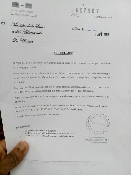 Dans un circulaire du Ministère sénégalais de la Santé et de l’Action sociale en date du 16 juin 2017, il est écrit : « Nous avons eu à diagnostiquer en un mois, trois (3) cas importés de fièvre virale hémorragique Crimée Congo venant de la Mauritanie. Ces cas ont été pris en charge dans les hôpitaux de Fann et de Dantec.»