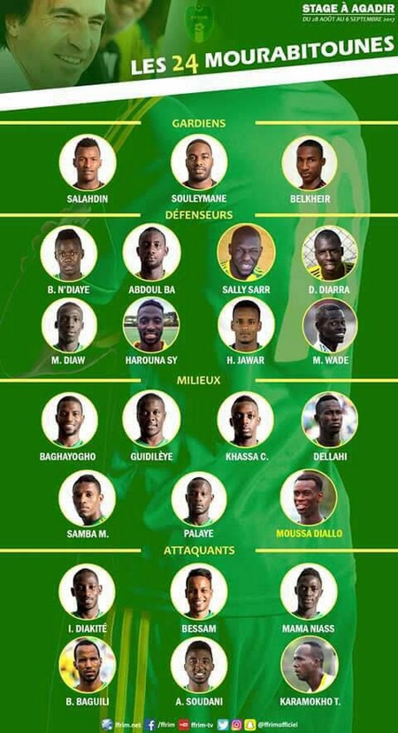 Attaquants (6) : Ismail DIAKITÉ (Ittihad Tanger/Maroc), Khalil Moulaye Ahmed « BESSAM » (Al Ahly Benghazi SC/Lybie), Mamadou N’’Diacko NIASS (Salam Zgharta/Liban), Babacar BAGUILI (US Biskra/Algérie), Mohamed Abdallahi SOUDANI (Al-Watani/Arabie Saoudite), Moussa Karamokho TRAORÉ (FC Deuz)