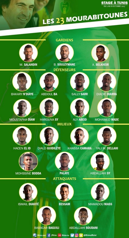 Attaquants (5) : Ismail DIAKITÉ (Ittihad Tanger/Maroc), Khalil Moulaye Ahmed « BESSAM » (Al Hilal Benghazi SC/Lybie), Mamadou N’’Diacko NIASS (Salam Zgharta/Liban), Babacar BAGUILI (US Biskra/Algérie), Mohamed Abdallahi SOUDANI (Al-Watani/Arabie Saoudite)