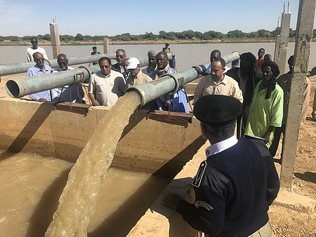 Il a d'abord inauguré un chenal d’irrigation, long de quatre kilomètres, dans la localité de Djekari, arrondissement de Tékane. Ce chenal permettra l’irrigation de 1500 hectares qui profiteront à 5846 citoyens.