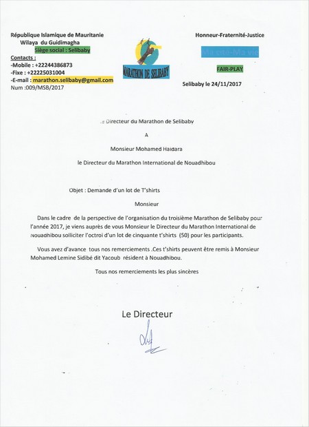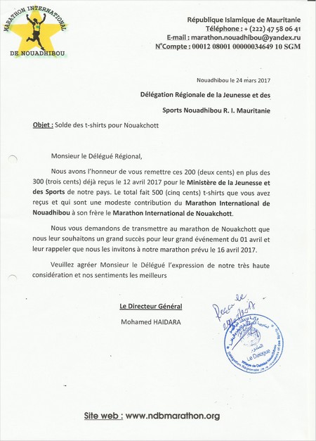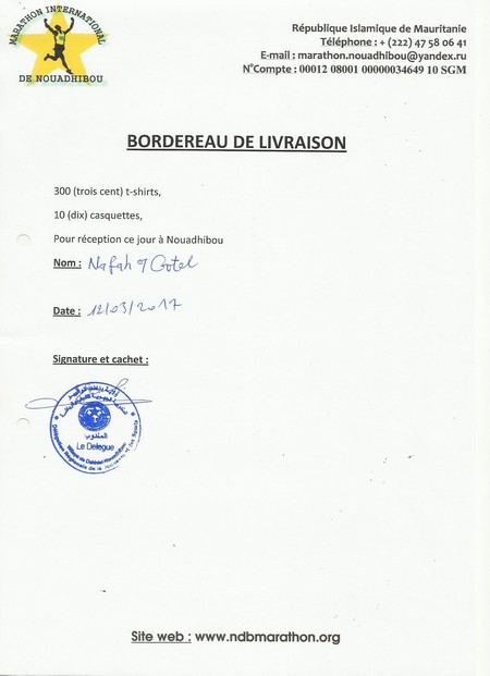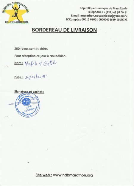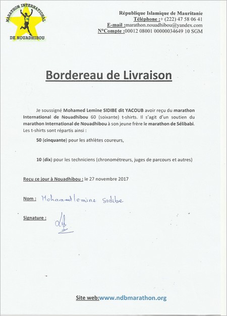 REPONSE : Je confirme que les 500 t-shirts ont été remis au Délégué de Nouadhibou pour le marathon de Nouakchott qui s’est tenu le 01 avril 2017 (voir les BL ci-joints). La liste de ceux qui ont bénéficié de nos soutiens est longue mais essayons d’en citer quelques-uns le marathon Tiris Zemour, le marathon de SELIBABI, la Marathon de NOUAKCHOTT, l’association Repas Pour Tous, Miya Basket, Brakna Football Club, l’Association STOP DABETE, la Direction Régionale de l’Enseignement Nationale, les colonies de vacance qui séjournent chaque été à Nouadhibou, et …