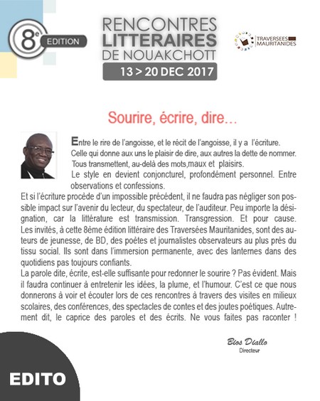 Traversées Mauritanides - Nouakchott abrite du 13 au 20 décembre 2017 la 8e édition des Rencontres littéraires Traversées Mauritanides sous le thème : Ecrits, Sourires de vies.