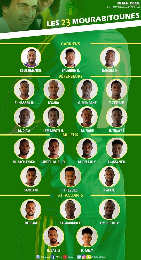 Le Reflet - La liste des 23 mourabitounes qui disputeront le Championnat d’Afrique des Nations (CHAN 2018), a été dévoilée ce lundi 08 janvier 2018. L’annonce a été faite par le sélectionneur national Corentin Martins, au cours d’une conférence de presse organisée à la fédération mauritanienne de football (FFRIM). La Mauritanie disputera le match d’ouverture contre le Maroc, pays organisateur.