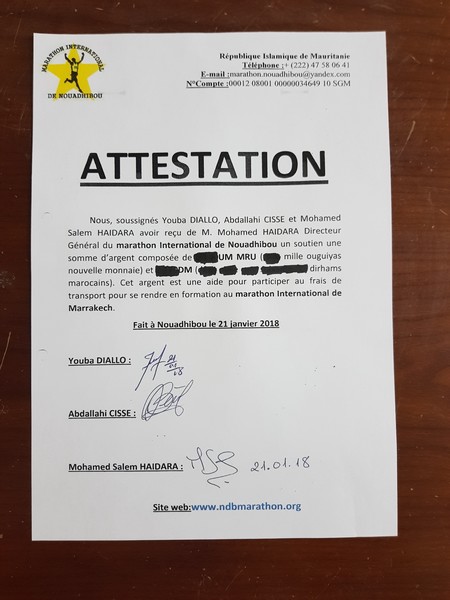 3 – : Durant toutes ces années d’existence du Marathon International de Nouadhibou j’ai toujours pris en charge mes frais de voyage au (Maroc, Sénégal, France, Hollande, USA et autres), les frais d’électricité et d’internet du bureau du marathon sans bruit seuls le savaient son Excellence M. Mohamed DJIBRIL (Ministre de la Jeunesse et des Sports), l’Honorable Député de Nouadhibou M. Ghassem BELALI, son Excellence M. BOUGHOURBAL Moulaye Abasse (Président d’Honneur du marathon), M. Mohamed Vall AHMED YOURA (ancien Wali de Nouadhibou) et ma famille. Ici je vous révèle en exclusivité une réalité de notre marathon que beaucoup ignorent et ainsi va la vie chez nous. Ces sacrifices m’ont donné un respect et une considération en Mauritanie et surtout à l'étranger. Ce sont ces actes bénévoles qui font que le Directeur de notre marathon peut, DIEU merci, faire héberger gratuitement des gens à l’étranger et faciliter les visas liés aux activités de notre marathon. J'ai la joie d'informer les lecteurs que les prochaines formations se feront à New York aux USA et à Leiden en Hollande et le choix se fera sur des critères de transparence et de services rendus au marathon International de Nouadhibou.