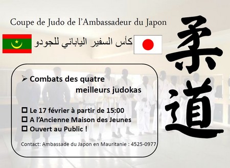 Ambassade du Japon | Mauritanie - L'Ambassade du Japon en Mauritanie a l'honneur d'annoncer le lancement du tournoi de la coupe de Judo de l'Ambassadeur du Japon pour la première fois ici à Nouakchott,