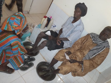 Place aux consultations d’adultes, de personnes âgées et d’enfants. L’équipe médicale est assistée par les jeunes garçons et filles de l’association des jeunes de Bakaw qui ont déployé toutes leurs énergies du début jusqu’à la fin de la caravane de santé mobile. Vérification de la tension des patients, prises de sang, déparasitages des enfants et plus impressionnant, c’est l’alignement de nombreuses assiettes remplies d’eau mélangée à un produit pharmaceutique où la plupart des patients, des personnes âgées essentiellement y trempent leurs pieds au bout de 15 minutes.