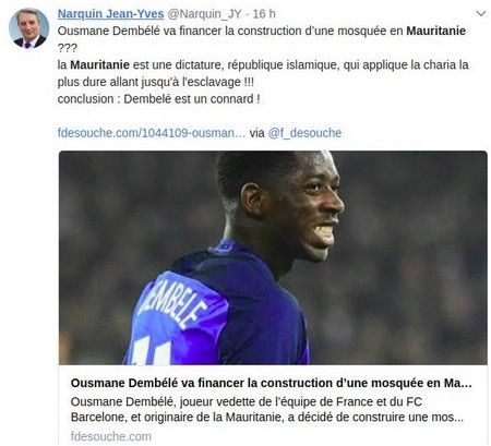 Maroc Leaks - De nombreux sites se sont fait écho de la décision d’Ousmane Dembelé de financer la construction d’une mosquée en Mauritanie, son pays d’origine. Une nouvelle qui a excité les militants du FN qui se sont déchaînés contre le Pays du Million de Poètes.