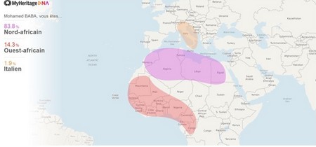Quatre semaines plus tard, je reçois le résultat suivant : Je serais 83,8% Nord-africain, 14,3% Ouest-Africain et 1,9% Italien. Les zones colorées sur la carte montrent l’étendue géographique que recouvrent les trois origines. Pas un brin d’ADN ne provient de la péninsule arabique. Je serai donc « 3arbi » sans avoir d’origine Moyen-orientale.
