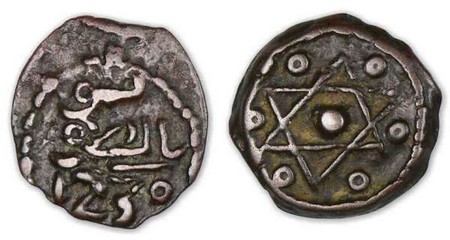 La présence de l’étoile à 6 branches (ou parfois à 5 ou à 8 branches) est fréquente sur les monnaies alaouites marocaines, où elle a pour nom « sceau de Salomon » ; cet emblème n’a pas de relation avec les présence éventuelle de communautés ou de commerçants juifs. »