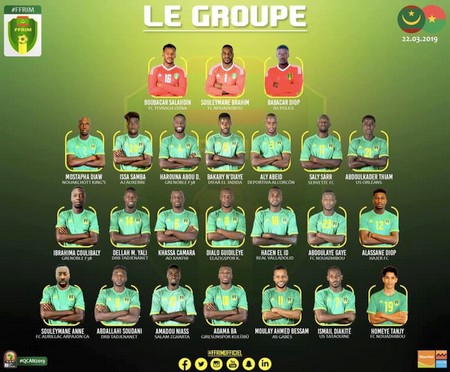 Défenseurs: Bakary N’DIAYE (Difaâ Hassani d’El Jadida/Maroc), Saly SARR (Servette FC/Suisse), Harouna ABOU DEMBA (Grenoble Foot 38/France), Issa SAMBA (AJ Auxerre/France), El Mostapha DIAW (Nouakchott King’s), Aly ABEID (Deportiva Alcorcón/Espagne), Abdelkader THIAM (US Orléans/France)