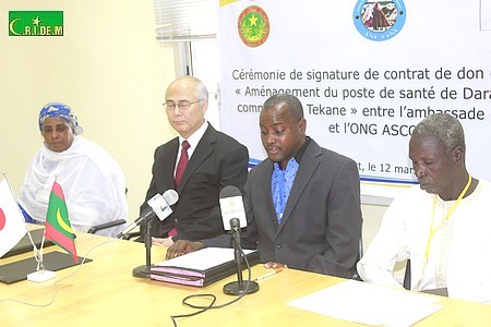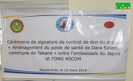 L’ambassade du Japon en Mauritanie et l’ONG Assistance Communautaire et Développement (ASCOM) ont procédé mardi 12 Mars à Nouakchott à la cérémonie de signature du contrat relatif au "Projet d’aménagement du poste de santé de Dara Salam à la commune de Tékane".