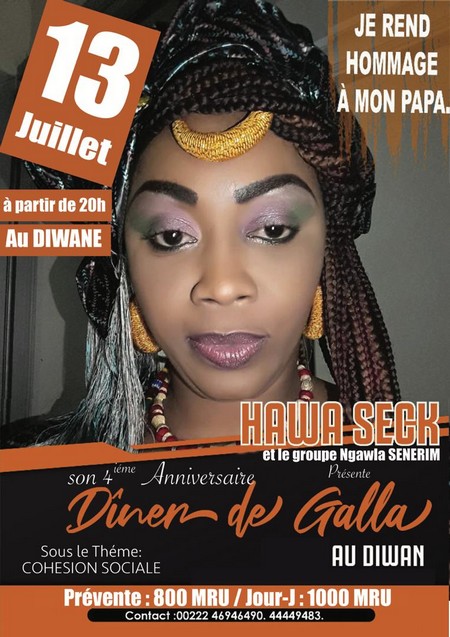 Cridem Culture - Le groupe Ngawla SENE-RIM, dirigé par la grande ambassadrice de la paix, Hawa Seck, qui a pour objectif de contribuer au rayonnement de la culture mauritano-sénégalaise, organise son quatrième anniversaire qui aura lieu le 13 Juillet, au Diwane, à Nouakchott, à partir de 20heures, sous le thème de la cohésion sociale.
