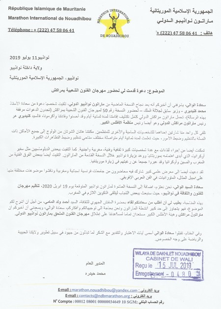 Son Excellence le Pr KNIDIRI est le Président du marathon International de Marrakech et aussi le Président de l’Association du Grand Atlas. Ayant appris par ses collaborateurs que les stagiaires de notre marathon sont intéressés par la Culture et les Techniques des festivals, son Excellence le Pr KNIDIRI m’invita avec ma fille et mon épouse à la 50 éme Edition du Festival des Arts Populaires (pour plus de détails voir SVP la note adressée au Wali de Dakhlete Nouadhibou ci-jointe pour information). J’ai profité de ce séjour pour apprendre et voir comment les choses se passent. J’en ai parlé à mon retour au staff de notre marathon et ils approuvent de tenter l'aventure.