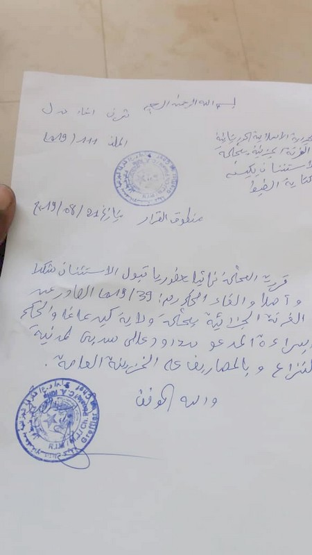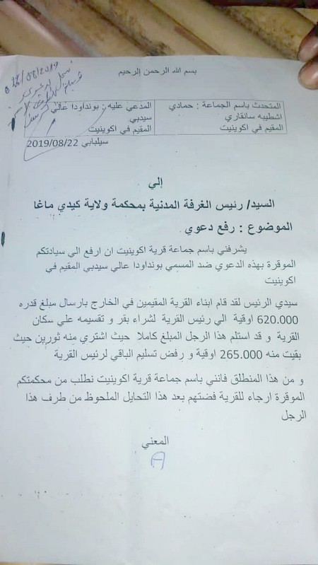 Image de la nouvelle plainte enregistrée par le tribunal de Selibabi le 22/08/2019 sur Boundaouda,c'est à dire