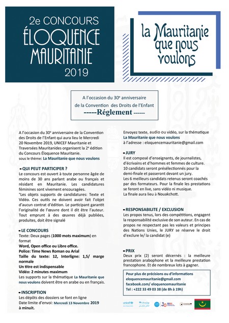 Le concours est ouvert à tous les Mauritaniens âgés de moins de 30 ans. Les participants ont jusqu’au 13 novembre 2019 pour envoyer leurs productions : texte, audio ou vidéo par mail à : eloquencemauritanie@gmail.com