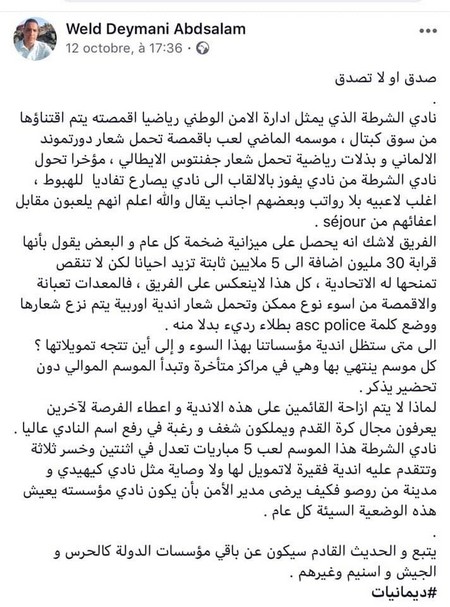 L’intéressé avait publié un tweet sur son compte Facebook dans lequel il critiquait ledit club.