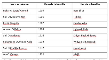Je reproduis et commente ici, le tableau, de la page 76 du manuel d’histoire de la 6AF ; manuel de l’élève illustrant les héros de la résistance coloniale en Mauritanie :