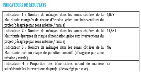 • Activités de développement communautaire : le projet financera des initiatives de renforcement de la résilience et d'amélioration des moyens de subsistance et du bien-être des personnes et des communautés dans ces huit communes: Sebkha (chaine du froid; séchage du poisson), El Mina (Salines), Tevragh Zeina (aménagement des marres), Dakhlet Nouadhibou (tissage de filet et chaine du froid,), Benichab, Keur Macen (villages de Ndiago), Tiguint, et Chami.
